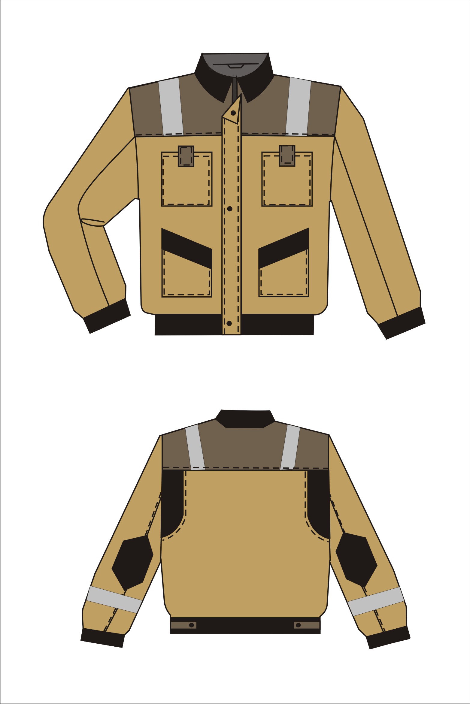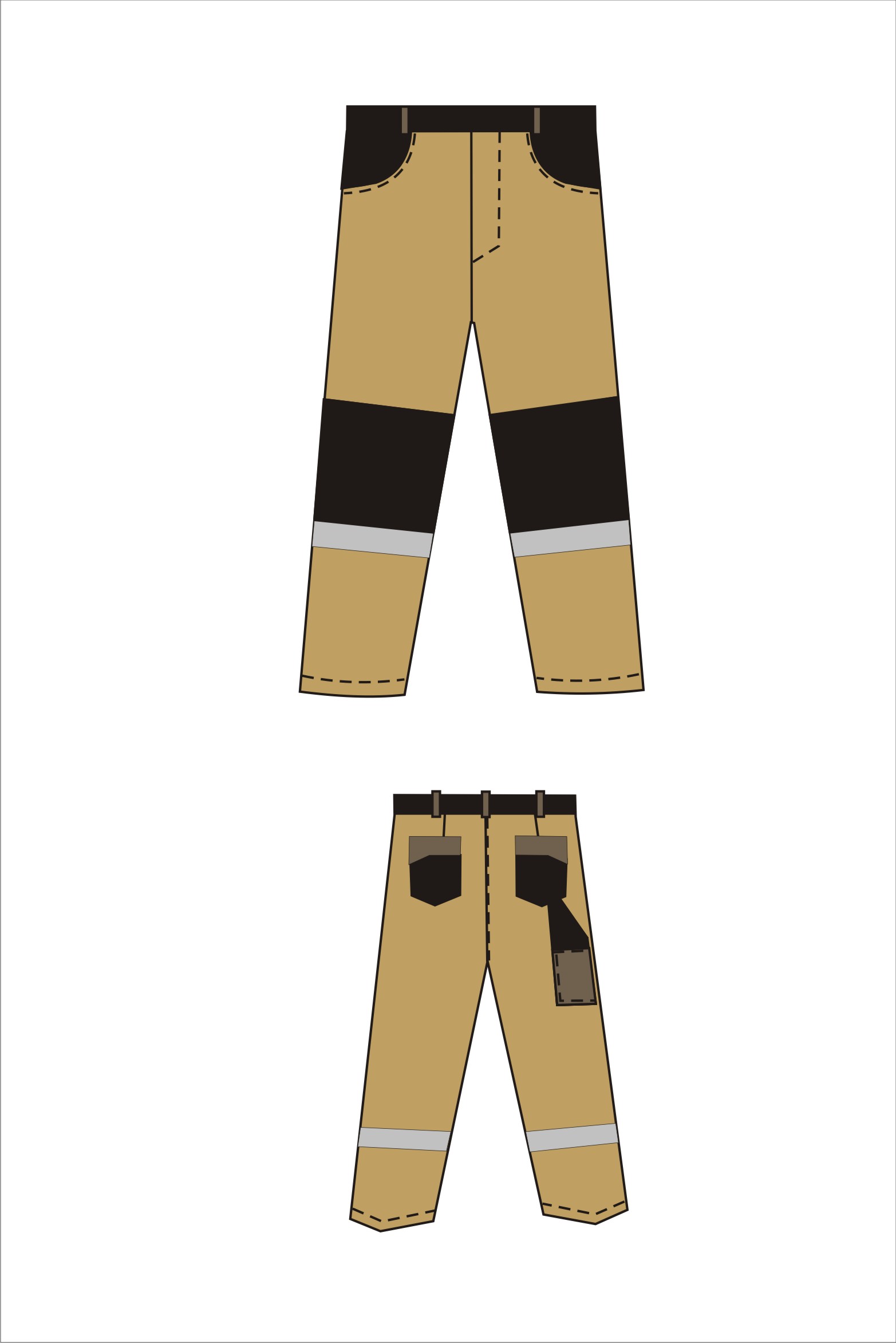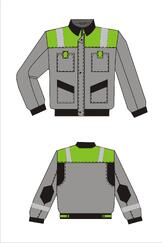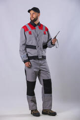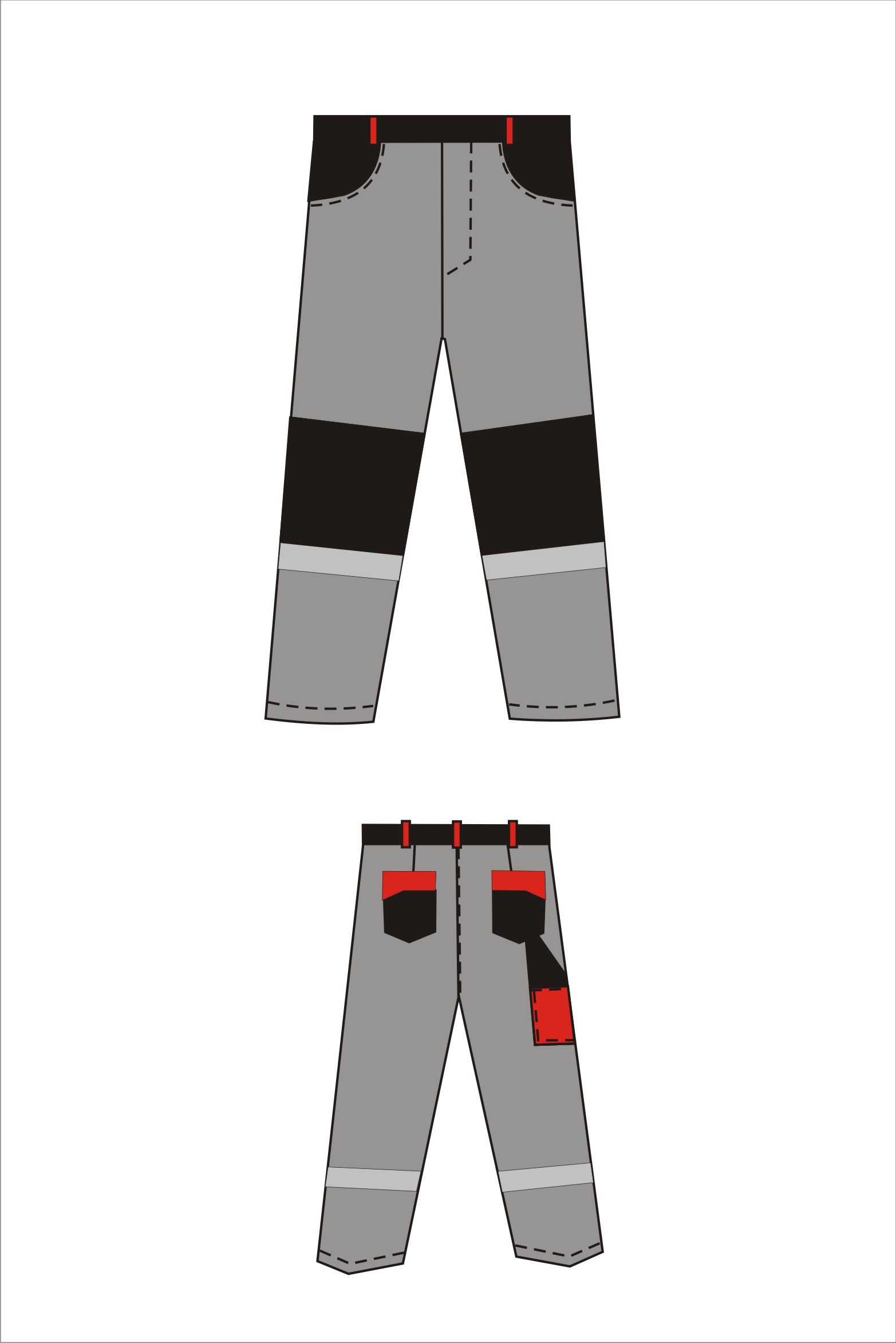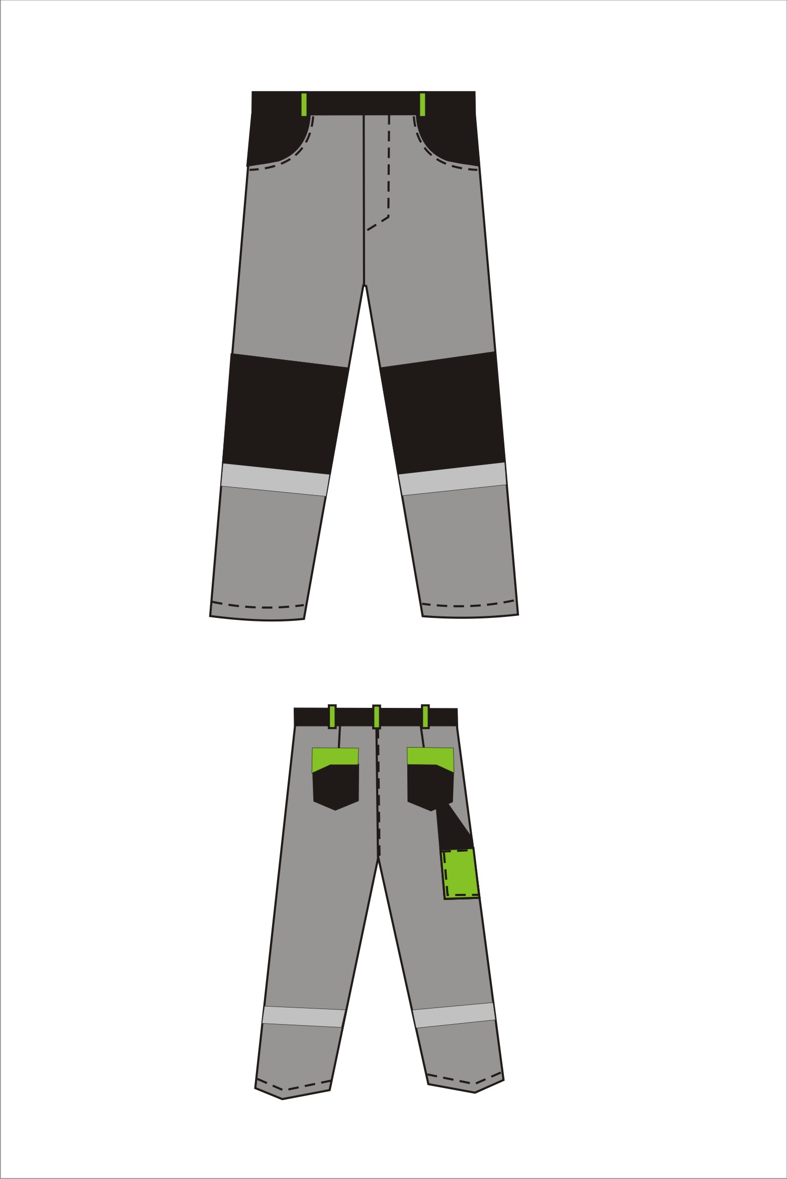 Наколенники с выточками. Застежка гульфик и откосок. На поясе 5 шлевок.Светоотражающая лента по рукаву и кокеткам полочки и спинки.