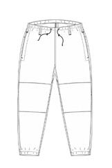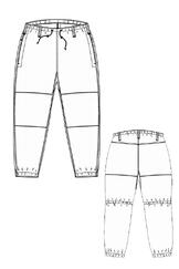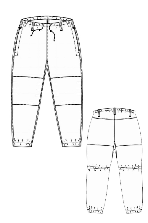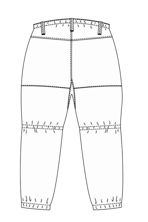 Задние половинки брюк с отрезными кокетками и усилительными накладками. На задних половинках на уровне колен кулиса, внутри которой вшита эластичная тесьма.