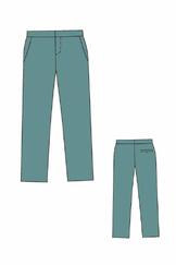 Верхний срез брюк обработан притачным поясом, застегивающимся на одну обметанную петлю и одну пуговицу.