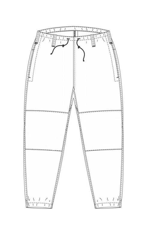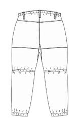 Задние половинки брюк с отрезными кокетками и усилительными накладками. На задних половинках на уровне колен кулиса, внутри которой вшита эластичная тесьма.