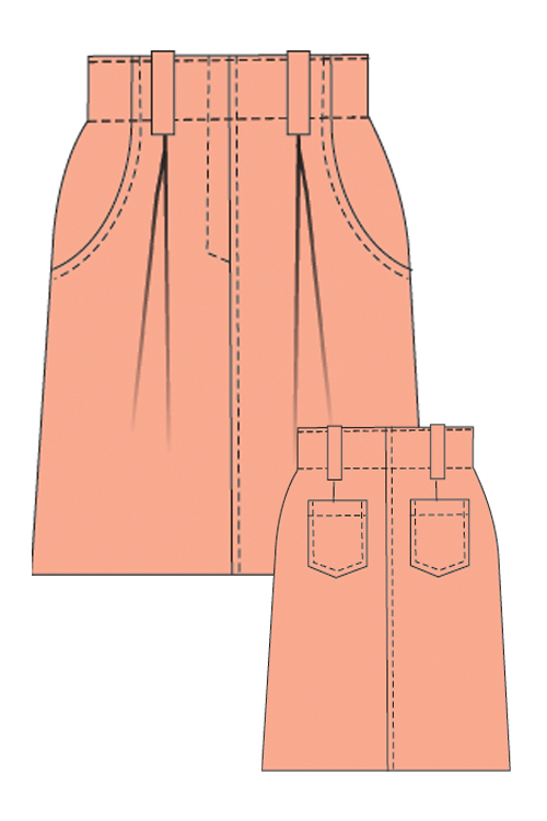 Юбка на переднем полотнище с двумя встречными складками и карманами с отрезным бочком.